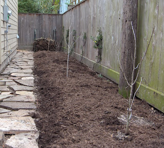 I have been visualizing a kitchen garden there so long that I sort of ceased noticing it is really bare. The bamboo hastily jammed into the beds in the foreground remains there to hold sheets over the little citrus trees if it should freeze again.